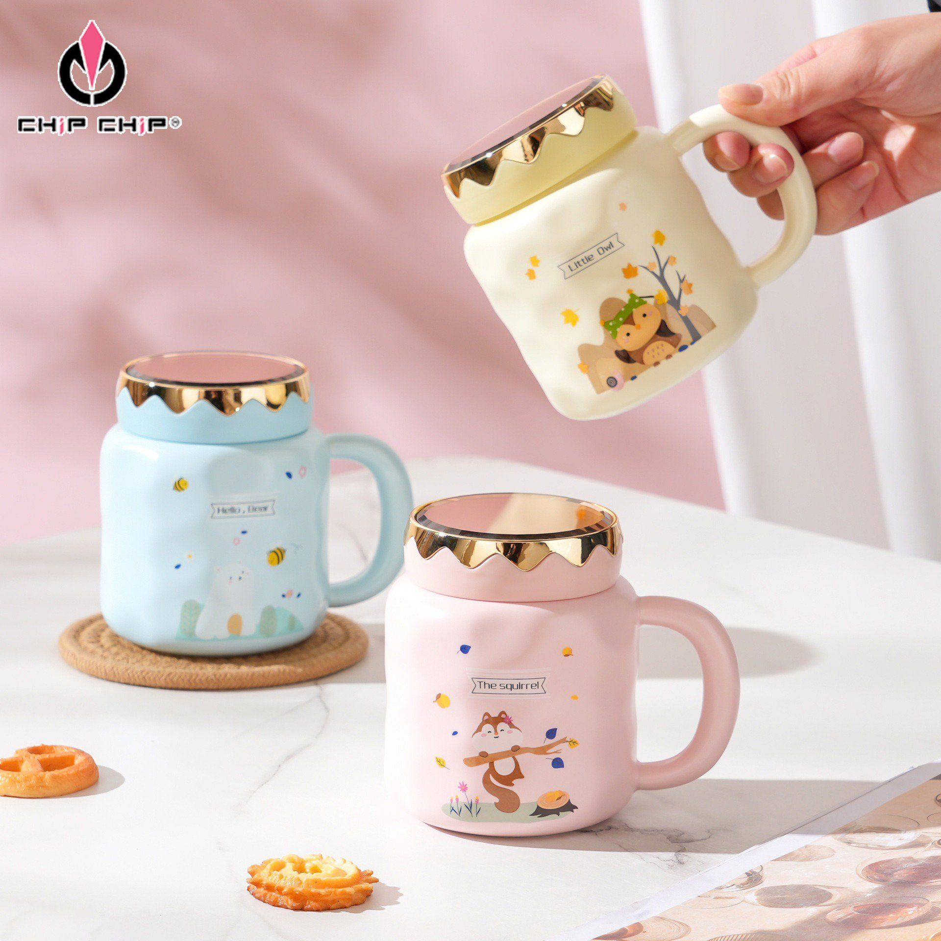 Từng mẫu ly mang thông điệp riêng – “Cute Rabbit”, “Hello Bear”, “Little Owl”, “The Squirrel” – tượng trưng cho niềm vui, sự năng động và tinh thần tích cực. Bề mặt ly phủ men mịn, bóng nhẹ, giúp màu sắc tươi tắn, lâu phai và dễ lau chùi khi sử dụng.